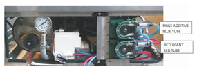 The model 727E is supplied with factory installed liquid detergent and rinse additive pumps to automatically dispense during each wash & rinse cycle. Before accessing the bottom section of the dishwasher, make sure that the power is turned off at the source (breaker panel).