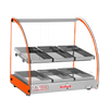 Vibrant Presentation and Smart Heating: This unit features an orange anodized aluminum exterior and clean-lined design for a modern look. It includes two stainless steel shelves with six food trays and rear sliding tempered glass doors for operator access. LED lighting and clear glass panels optimize visibility and customer appeal.