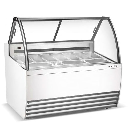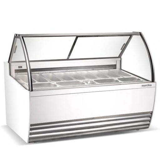 The Marchia refrigerated ice cream gelato display freezer includes LED lighting and 13 stainless steel pans as well as a user accessible digital te...