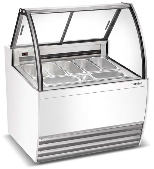 The Marchia refrigerated ice cream gelato display freezer includes LED lighting and 10 stainless steel pans as well as a user accessible digital te...