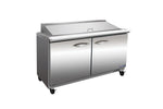 Mega top sandwich and salad prep table with extended pan rail for maximum topping positions and full cabinet storage below