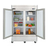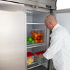Reach-in refrigerator with two self-closing, locking solid doors with easy-to-grip recessed handles