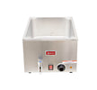 The adjustable thermostat lets you set temperature from 86 to 194°F, which covers the range from warm holding for delicate items to full hot holding for dense entrees. At 1,200 watts, the element brings the water bath up to temperature quickly and recovers fast after pans are swapped during service. A variety of adapter inserts are available separately, so you can configure the chamber for different pan combinations beyond the standard full-size and half-size options.