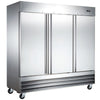 This triple door reach-in freezer with 72 cubic feet of capacity features a heavy-duty stainless steel interior and exterior, ensuring many years of dependability in even the most demanding commercial settings. Insulated self-closing lockable doors allow units to hold safe temperatures in the hottest kitchens. Included are 9 wire shelves with a versatile shelf slide design. And with the ability to fit full-size hotel pans in either orientation. Lockable heavy-duty wheels come standard. This unit uses HYDRO-CARBON R290 refrigerant, which is environmentally friendly and more efficient than R134a/R404a refrigerant.