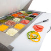 Equipped with sanitary food grade quality 9" cutting board, full set of divider bars and eighteen (18) 4" deep pans