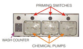 This unit is equipped with three (3) chemical pumps; located behind the bottom panel (below the door). Each will inject a different chemical product at a specific time during the wash and rinse cycle. The chemical pumps have sufficient length of tubing hose which can be inserted into gallon size containers, near the dishwasher. The lines can be passed through the center of the dishwasher out either side. The chemical pumps have colored tubing for ease of identification. The colors are as follow: Red for Detergent Clear for Sanitizer Blue for Rinse-additive To prime the pumps; push the toggle switch above each pump until the products have reached the sump.