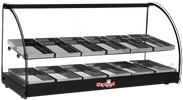 High-Capacity Heating and Display: This countertop warmer features two stainless steel shelves that accommodate 24 included trays, making it ideal for high-traffic food retail environments. Rear sliding tempered glass doors allow for easy restocking and serving.