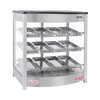 Built for High Performance and Visibility: This countertop warmer features tempered glass on all sides and swing-open rear doors, allowing full product visibility and easy access. It comes with three adjustable nickel-plated shelves and twelve stainless steel trays, illuminated by bright LED lighting to highlight food offerings.